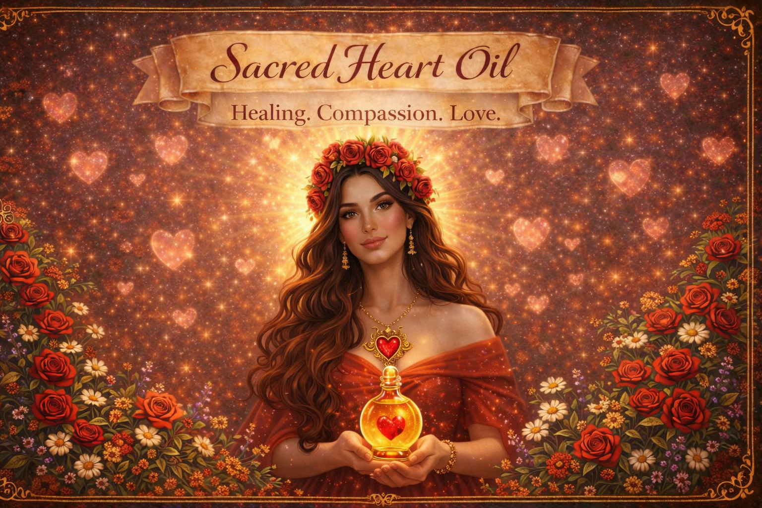 My RitualI use this oil when I need to feel strong and steady.I rub the oil into my shoulders, arms, and chest,breathing slowly and deeply.This helps my body feel safe being confidentwithout going into tension or fear.❤️ Sacred Heart Oil — Healing & Self-Love